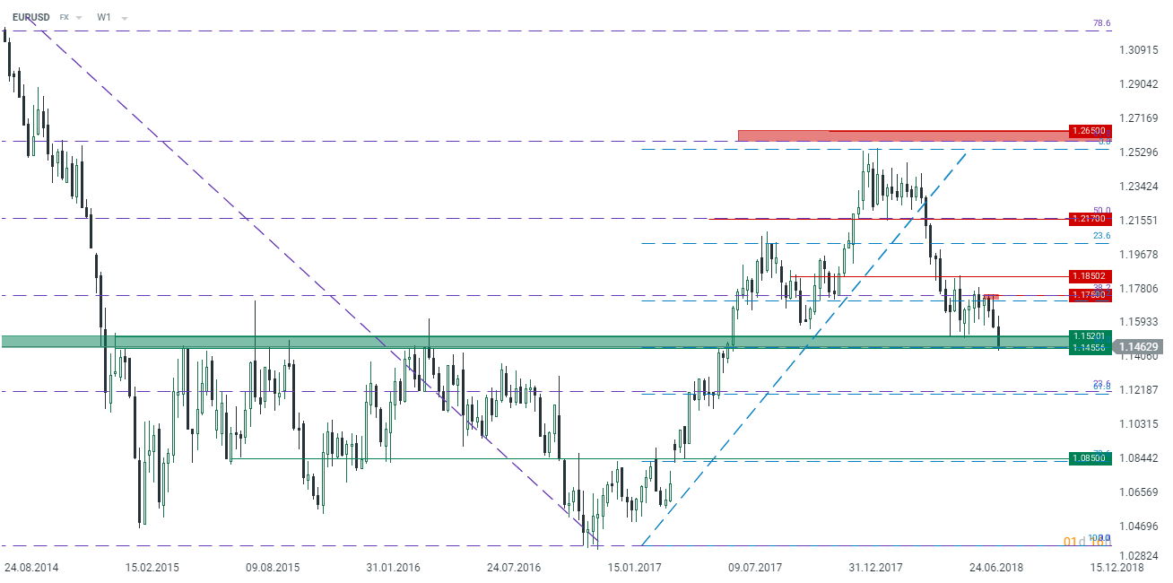 Cotația EURUSD sparge un nivel important de suport aflat în apropierea pragului de 1,1450. Nivelul de închidere pe graficul W1 s-ar putea dovedi critic pentru evoluția perechii din următoarele săptămâni. Sursa: xStation5