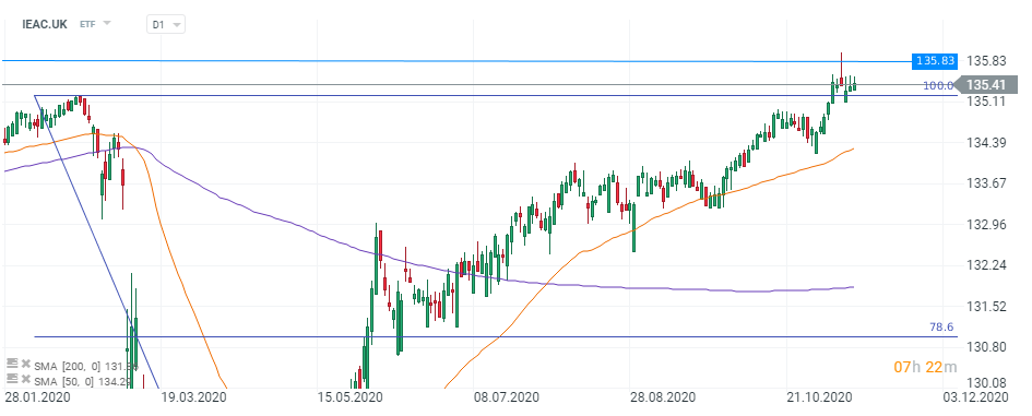Analizând graficul ETF-ului IEAC, observăm că optimismul de la început de săptămână a determinat o secvență ascendentă dinamică, în timpul căreia a fost atins un nou maxim istoric (136 USD), după depășirea recordului anterior (135,83 USD). Totuși, după acea mișcare evoluțiile s-au temperat, iar la momentul actual prețul pare să-și fi reluat tendința laterală în jurul nivelului 135,40 USD. Din punct de vedere tehnic, instrumentul pare să se afle într-o poziție destul de dificilă pentru a spera la o extindere a mișcării ascendente, mai ales pe fondul reorientării interesului investitorilor către tendințele cotidiene. Totuși, atâta timp cât apetitul pentru risc va rămâne la niveluri ridicate, vânzătorii ar putea evita să încerce o mișcare.