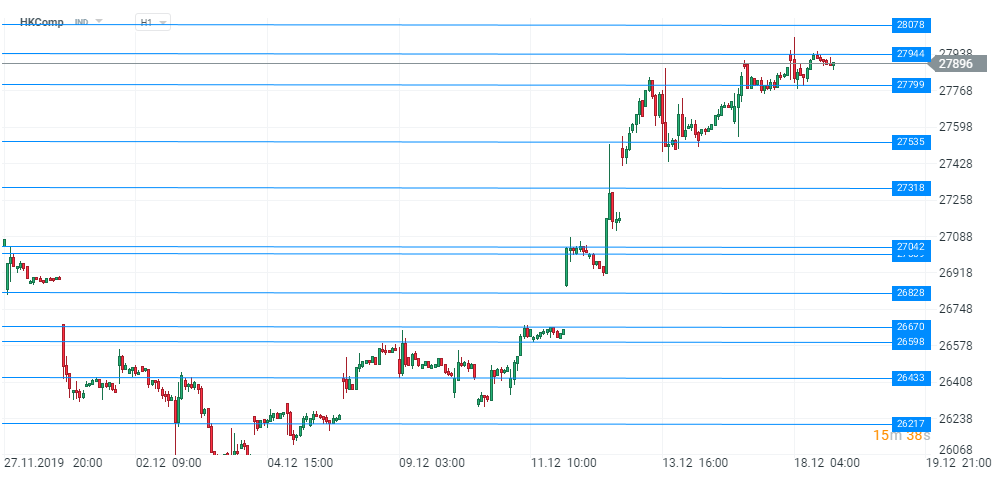 Acest scenariu s-a dovedit a fi favorabil pentru piața bursieră din Hong Kong, indicele HKComp atingând în timpul sesiunii de astăzi cel mai ridicat nivel din iulie (28023 puncte), pe baza entuziasmului legat de Prima Fază a acordului. Totuși, câștigurile au fost pierdute ulterior, investitorii devenind mai prudenți în lipsa prezentării de noi detalii legate de înțelegerea comercială. Analizând evoluția detaliată a pieței, observăm că subindicele energetic a crescut cu 1,6% iar sectorul IT cu 0,5%, în timp ce sectorul financiar a stagnat iar piața imobiliară a pierdut 0,2%.