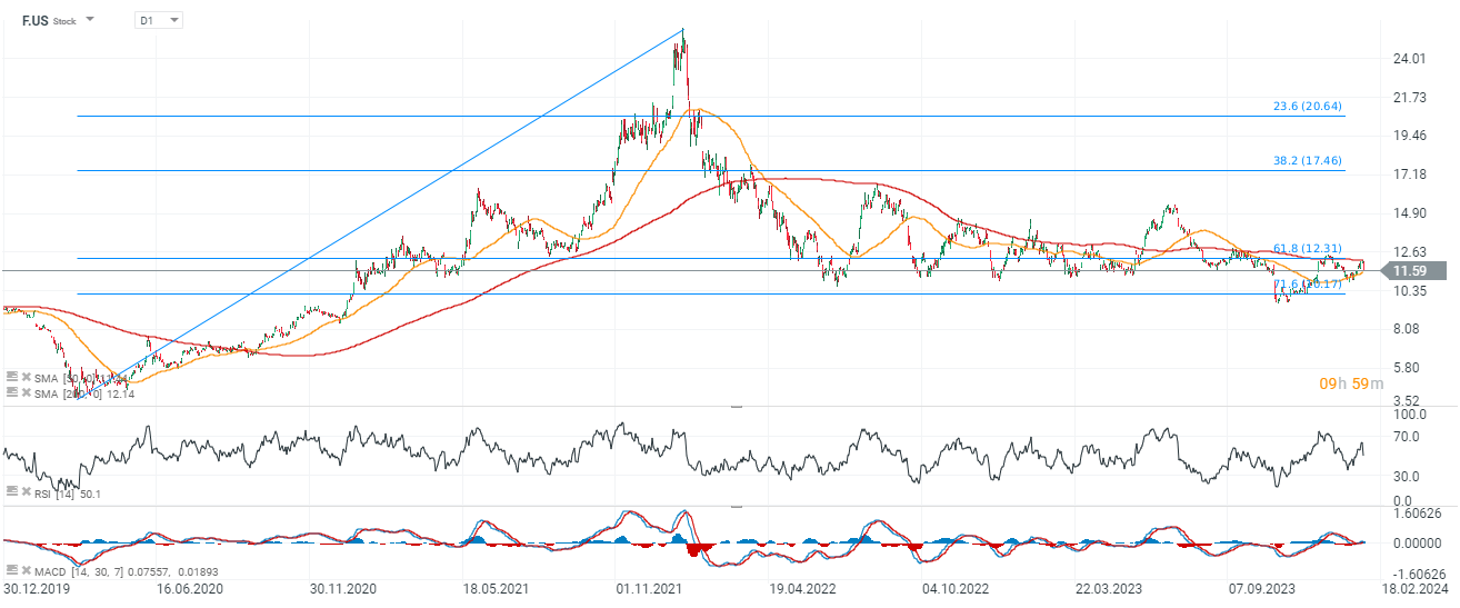 Prețul acțiunilor Ford a atins recent un nivel de rezistență cheie la media mobilă de 200 de ședințe (în jur de 12 dolari pe acțiune), unde a reacționat cu un declin puternic. Rezultate și estimări potențial mai bune decât cele așteptate ar putea deschide calea pentru ca acțiunile să urce până la 17,5 dolari pe acțiune. Pe de altă parte, surprizele negative ar putea duce la o testare a zonei de 10 dolari, unde observăm o retragere Fibonacci de 71,6% a valului ascendent din 2020 și a reacțiilor anterioare ale prețurilor, precum și a minimelor din 2023.