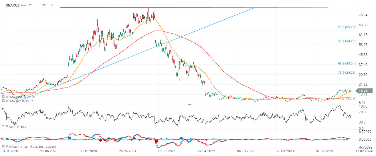 - poate sugera că profitabilitatea este încă sub așteptări (este necesară reducerea costurilor). Snap este finanțată în mare parte prin datorii, ceea ce o face extrem de dependentă de condițiile economice ale pieței de publicitate. De asemenea, este esențial să se ia în considerare riscul reprezentat de concurența tot mai mare, cum ar fi TikTok sau "familia" de aplicații Meta.
