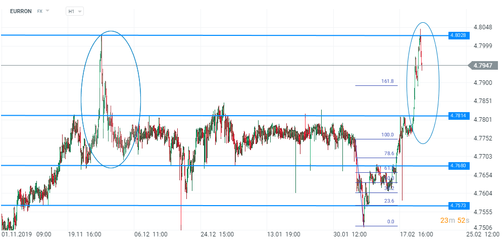 Ultimele două zile au adus evoluții slabe din partea leului în raport cu moneda unică europeană. Ieri, cotația EURRON a depășit limita superioară a canalului lateral de la 4,7814 pentru prima dată de la sfârșitul anului trecut. Un posibil factor ce a stat la baza mișcării pare a fi creșterea aversiunii față de risc la nivel global, care a determinat corecții semnificative ale monedelor ”exotice”. Pesimismul a venit în urma a noi motive de îngrijorare legate de epidemie. În continuare există întrebări cu privire la impactul economic al virusului, iar revizuirile descendente ale perspectivelor din partea marilor companii tind să determine mișcări la nivelul piețelor, influențând încrederea investitorilor.