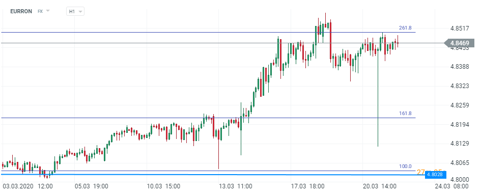 În acest context, leul a suferit o nouă lovitură în raport cu monedele majore. A doua parte a sesiunii de miercuri a marcat atingerea unui nou maxim istoric al cursului EURRON, cotația reușind să depășească un nivel important pentru investitori, cel de la 4,85, care reprezintă o barieră psihologică, dar este susținut și de o retragere exterioară Fibonacci de 261,8% din impulsul ascendent din perioada 18 - 21 februarie. Noile măsuri de stimulare a economiei anunțate de BCE au temperat entuziasmul monedei unice europene, iar EURRON s-a reîntors la mișcarea oscilantă în jurul nivelului de 4,84.