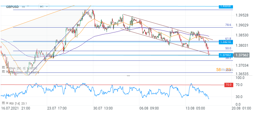 La momentul redactării, cotația testează o zonă cheie de susținere trasată de limita inferioară a canalului descendent de trend și nivelul de la 1,3755. Totuși, analizând indicatorul RSI observăm o imagine diferită. Recent, a fost spartă limita inferioară a intervalului neutru de la 30 de puncte. Dacă ținem cont de evoluțiile din trecut, acest fapt ar putea duce la o inversare a direcției pe termen scurt menită să împingă prețul din nou în intervalul de echilibru. Acest aspect ar putea să fie în favoarea cumpărătorilor pe termen scurt.