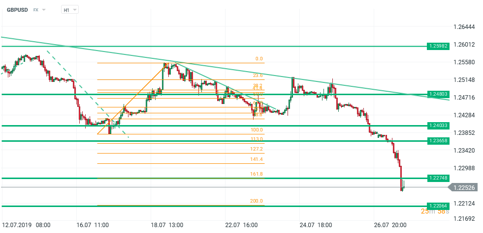 Astăzi începe mandatul lui Boris Johnson ca premier al Marii Britanii, iar primirea din partea pieței a fost una foarte rece: GBPUSD pierde 1.01% la ora 17.29, în timp ce EURGBP a crescut cu 1.03%. Traderii sancționează în primul rând poziționarea strictă a fostului primar al Londrei, care mărește riscul ieșirii fără acord din UE (varianta ”no-deal”). În ciuda unor date favorabile la nivelul creditării pentru persoane fizice, balanța a atârnat înspre re-evaluarea probabilității unui scenariu dezordonat, încurajat de declarația oficială potrivit căreia e avută în vedere o variantă ”hard” a separării de Europa. Ar putea fi o încercare a noului guvern de a smulge avantaje în discuțiile cu un oponent puternic, dar, coroborând cu declarațiile anterioare ale lui Johnson și cu încercarea de a trimite Parlamentul în vacanță în octombrie, e posibil ca acesta să fie totuși hotărât să nu prelungească termenul limită, cu niciun preț. Episoade corective temporare ar putea apărea, dar tendința descendentă a lirei e, pornind de la informațiile curente, dificil de stopat.
