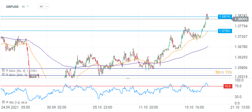 Din punct de vedere tehnic, perechea GBPUSD se află într-un punct interesant. În ciuda impulsului ascendent puternic, în ultimele ore lira sterlină a început să piardă din susținere și am observat o ușoară tendință de inversare. Această evoluție a apărut și în urma testării zonei de rezistență de la 1,3821. Pentru moment, acest obstacol pare a fi prea ”ambițios” pentru cumpărători, în special dacă avem în vedere și faptul că indicatorul RSI a depășit pragul de 70 de puncte, intrând în teritoriul de supracumpărare. În viitorul apropiat mișcarea de inversare a lirei sterline ar putea continua, în special dacă indicele dolarului american (USDIDX) va continua să se redreseze. Astfel, de urmărit este suportul de la 1,37550, care este susținut și de media mobilă de 50 de perioade (linia galbenă).