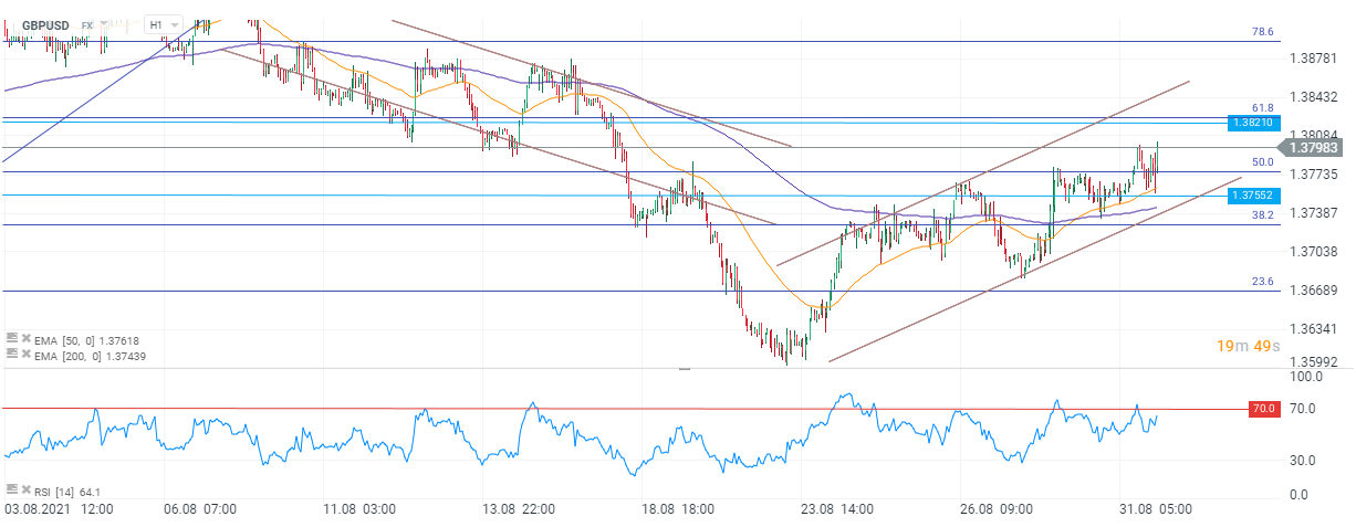 Analizând perspectiva tehnică, putem spune că mișcarea ascendentă a cotației ar putea continua atâta timp cât evoluează în interiorul canalului ascendent de trend. Deși a avut loc o secvență de scădere în timpul sesiunii de astăzi, nivelul de suport de la 1,37775 și-a confirmat importanța, fiind susținut de o retragere Fibonacci de 50% din impulsul ascendent de la jumătatea lunii iulie și începutul lunii august. Următorul nivel de urmărit pentru cumpărători se află la 1,38210 și este consolidat de o retragere Fibonacci de 61,8% din aceeași mișcare menționată anterior. Cât timp prețul se află în interiorul formațiunii ascendente, ar putea avea loc doar corecții pe termen scurt în intervalul canalului. Vânzătorii ar avea nevoie de o spargere în jos pentru a căpăta motive de optimism. Totuși, evenimentul din SUA de la sfârșitul săptămânii are potențialul de schimba atitudinea și de a alimenta o astfel de mișcare, prin urmare ar trebui urmărit cu atenție.