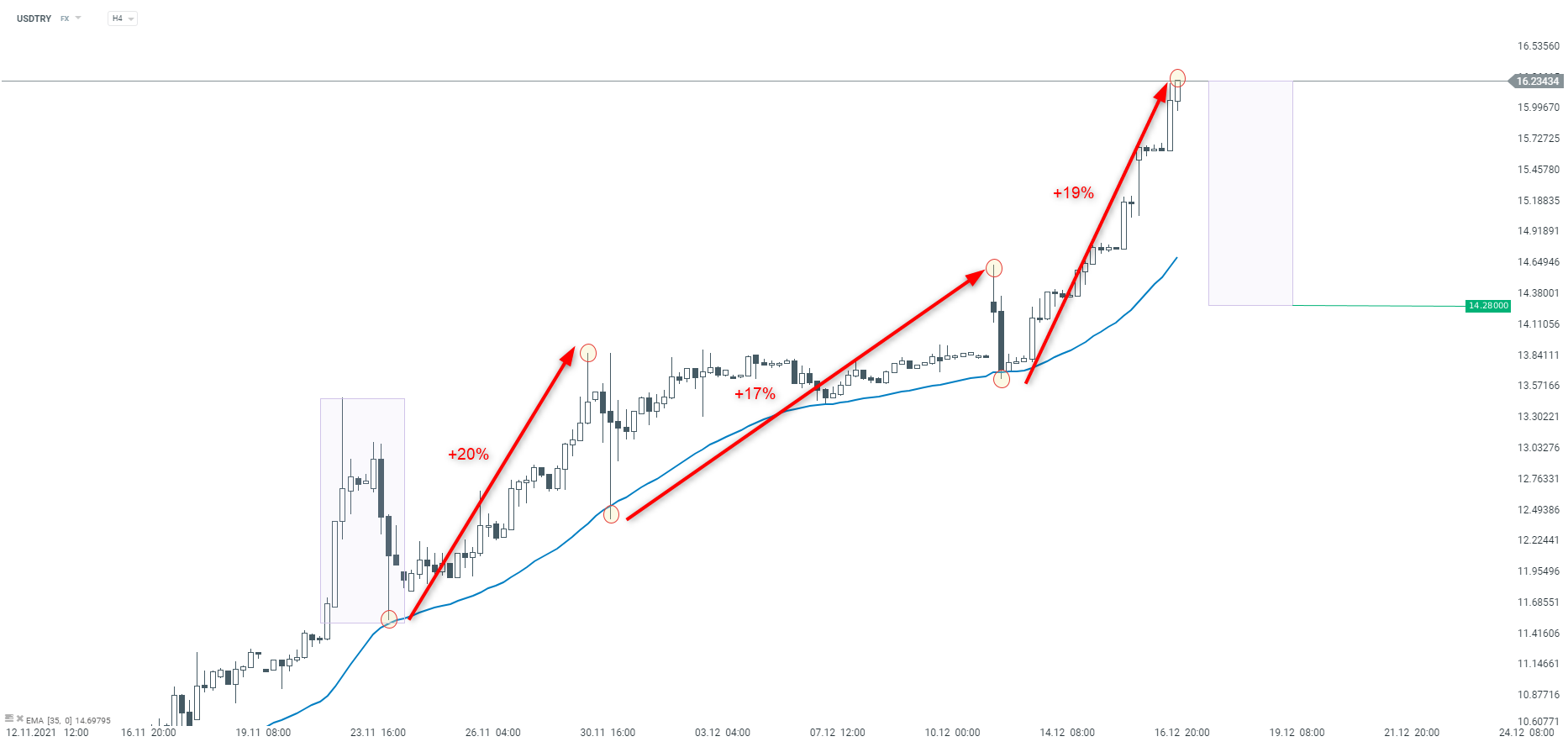 Mișcarea ascendentă a USDTRY este foarte puternică și are o susținere fundamentală solidă. Cu toate acestea, aruncând o privire asupra graficului, putem observa că o corecție descendentă abruptă pe termen scurt (7-10%) a avut loc după mișcări de dimensiune similară cu impulsul ascendent actual. Totuși, piața a revenit rapid la o mișcare ascendentă mai târziu.