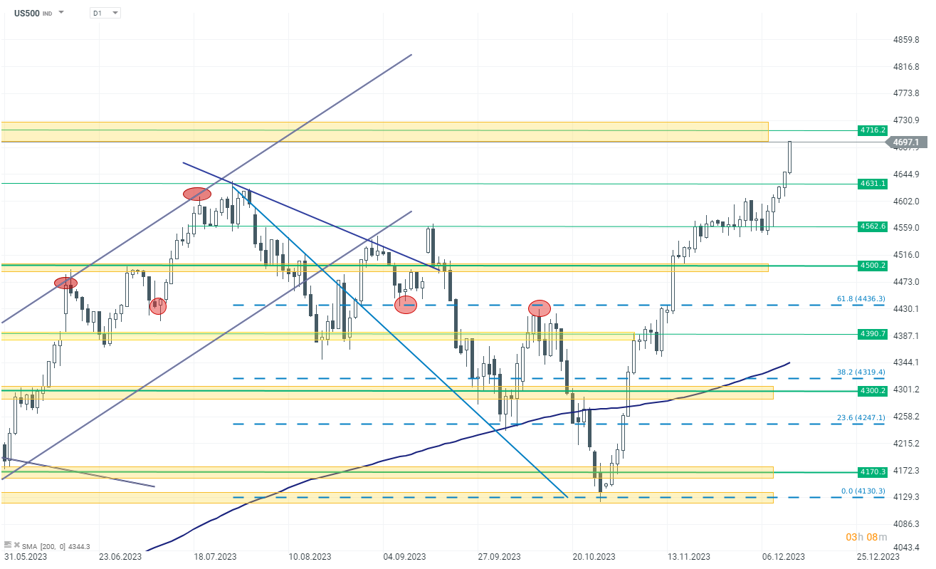Pe US500, cotațiile se apropie de următoarea zonă de 4.700 de puncte. Astăzi, indicele a înregistrat o creștere de peste 1,0% de la anunțarea deciziei FOMC. Sursa: xStation 5