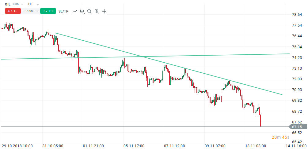 Sesiunea de astăzi, marți, 13 noiembrie a adus noi scăderi ale prețului petrolului, o nouă ședință într-o serie nefavorabilă. OPEC a estimat un nivel al cererii în creștere de 1.29 mil. barili, cu o ofertă a membrilor săi cu 2.23 mil. barili în plus. Petrolul a resimțit în aceste săptămâni și presiunea unei oferte a Iranului care nu a fost total eliminată - unele state continuă să importe de acolo - dar și revenirea producției de tip ”shale oil” din SUA, cu o reorientare a pozițiilor speculative ale fondurilor. Petrolul încercase o revenire ieri seară, pe seama dorinței Arabiei Saudite de a limita oferta, însă comentariul pe Twitter al președintelui (”prețurile ar trebui să fie mai jos, pe baza ofertei”) a readus presiunea de vânzare. Spargerea unei linii de trend descendent a accentuat mișcarea, astfel că petrolul Brent se află în apropierea unui suport important, la 66.69, minimul din aprilie. Spargerea sa, la închiderea zilei, ar fi un semnal nefavorabil, dar e de văzut dacă, după scăderi accentuate, un ricoșeu nu ar fi posibil, din punct de vedere tehnic.