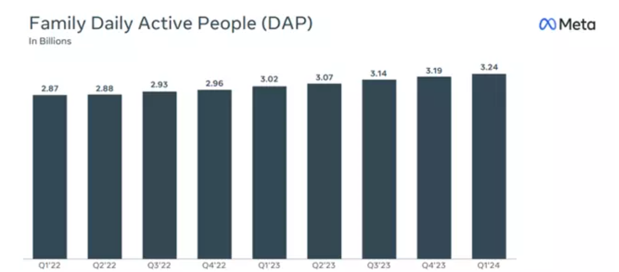 În Q1 2024, numărul de utilizatori Family Daily Active People (DAP) a fost în medie de 3,24 miliarde în martie 2024. În ciuda dimensiunii mari, aceasta este o creștere de 7% de la an la an. Numărul de anunțuri de afișare a crescut cu 20% de la an la an, iar prețul mediu al anunțului a crescut cu 6% de la an la an. Meta Platforms, IG