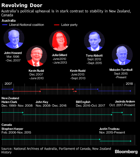 În ultimii ani, scena politică din Australia a fost tulburată de conflicte, spre deosebire de situația calmă din Noua Zeelandă sau Canada. Sursa: Bloomberg
