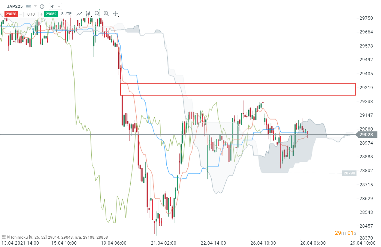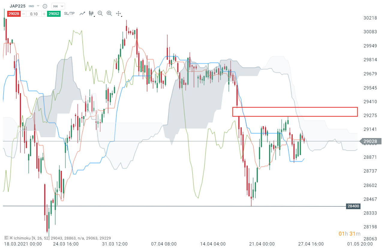 Pe 26 aprilie, prețurile nu au reușit să recupereze gapul bearish (zona roșie) și au scăzut la linia H4 Kijun (linia albastră) de la 28.830 puncte. Cumpărătorii au reușit să apere acest sprijin și o mișcare ascendentă a dus la următoarea rezistență - norul H4 Ichimoku. Acest nor acționează în continuare ca o rezistență puternică și împinge prețurile în jos. Următorul suport este linia Kijun menționată anterior la 28.830 puncte. Spargerea acestui nivel ar putea duce la o mișcare descendentă mai profundă către următoarea rezistență de la 28.400 de puncte. Pe de altă parte, dacă taurii reușesc să depășească norul H4, o rezistență puternică poate fi găsită la gapul bearish (zona roșie).