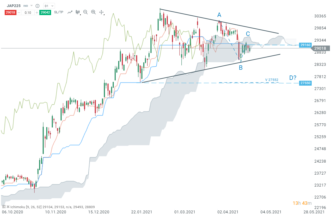 După ricoșeul din limita inferioară a triunghiului (B), JAP225 nu a putut depăși linia Kijun (linia albastră) la 29.160 puncte și a rămas în norul zilnic Ichimoku. În cazul în care taurii reușesc să mențină prețurile în interiorul norului, ar putea fi lansat un alt impuls ascendent. Pe de altă parte, o spargere sub limita inferioară a triunghiului ar putea duce la o mișcare descendentă mai accentuată. Într-un astfel de scenariu, primul suport de urmărit poate fi găsit la 27.550 de puncte.