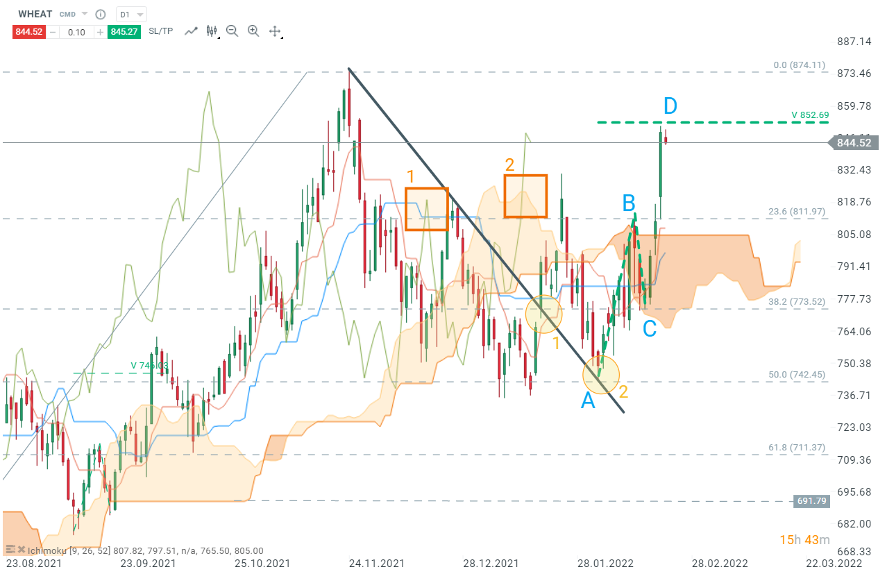 Tensiunile tot mai mari dintre Rusia și Ucraina au împins prețurile în sus și au permis de data aceasta un semnal de cumpărare validat de span Chikou (a doua casetă portocalie). Creșterea a luat forma unui val A, B, C și D cu o proiecție Hosoda „V” de 852,70. Acest obiectiv a fost atins după ce Putin a recunoscut independența republicilor Donețk și Lugansk. Prețul grâului ar putea crește la maxime istorice în cazul în care ambele țări ar avea probleme de aprovizionare. În acest caz, următoarea rezistență va fi ultimul maxim la 875, ultimul înainte de maximele din 2012 la 935.