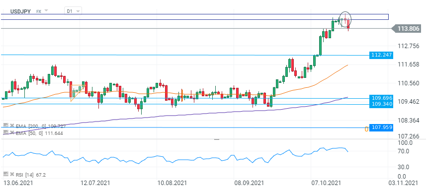 Din punct de vedere tehnic, situația perechii USDJPY de pe graficul D1 pare să indice o posibilă schimbare a direcției. După secvența ascendentă puternică dezvoltată la sfârșitul lunii septembrie, cumpărătorii au întâmpinat dificultăți în depășirea maximului atins în anul 2017. Problemele ar putea continua pentru cumpărători, pe grafic făcându-și apariția o lumânare Doji (cercul negru), care, de obicei, indică o inversare a trendului. În acest caz, secvența descendentă a prețului de astăzi s-ar putea extinde și în viitorul apropiat, principalul nivel de suport de urmărit este 112,247.