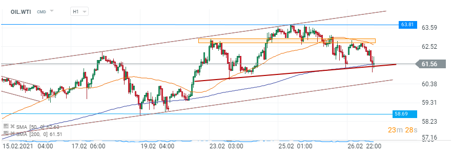 Începutul sesiunii a adus o deschidere pozitivă pentru petrolul WTI, care a reușit să atingă un maxim intraday la 62,93 USD, ceea ce presupunea un avans de peste 2,20%. Totuși, din acea zonă cotația a început să dea semne de oboseală și a avut loc o inversare. Pe graficul H1 se poate observa apariția unei formațiuni Head and Shoulders, nivelul ”umerilor” fiind în zona 62,80 - 63 USD (zona portocalie), în timp ce ”capul” este marcat de vârful local de la 63,81 USD. În cazul în care ar avea loc o spargere a neckline-ului (zona 61,30 USD), ar putea apărea o corecție mai amplă către 58,70 USD, care ar fi un potențial obiectiv. Totuși, trebuie să subliniem că ne aflăm în continuare în cadrul unei tendințe ascendente pe termen mediu, iar limita inferioară a canalului din zona 60,40 USD ar putea opune rezistență în calea scăderii. Scenariul bearish ar fi negat în cazul în care ar avea loc o spargere a zonei portocalii.