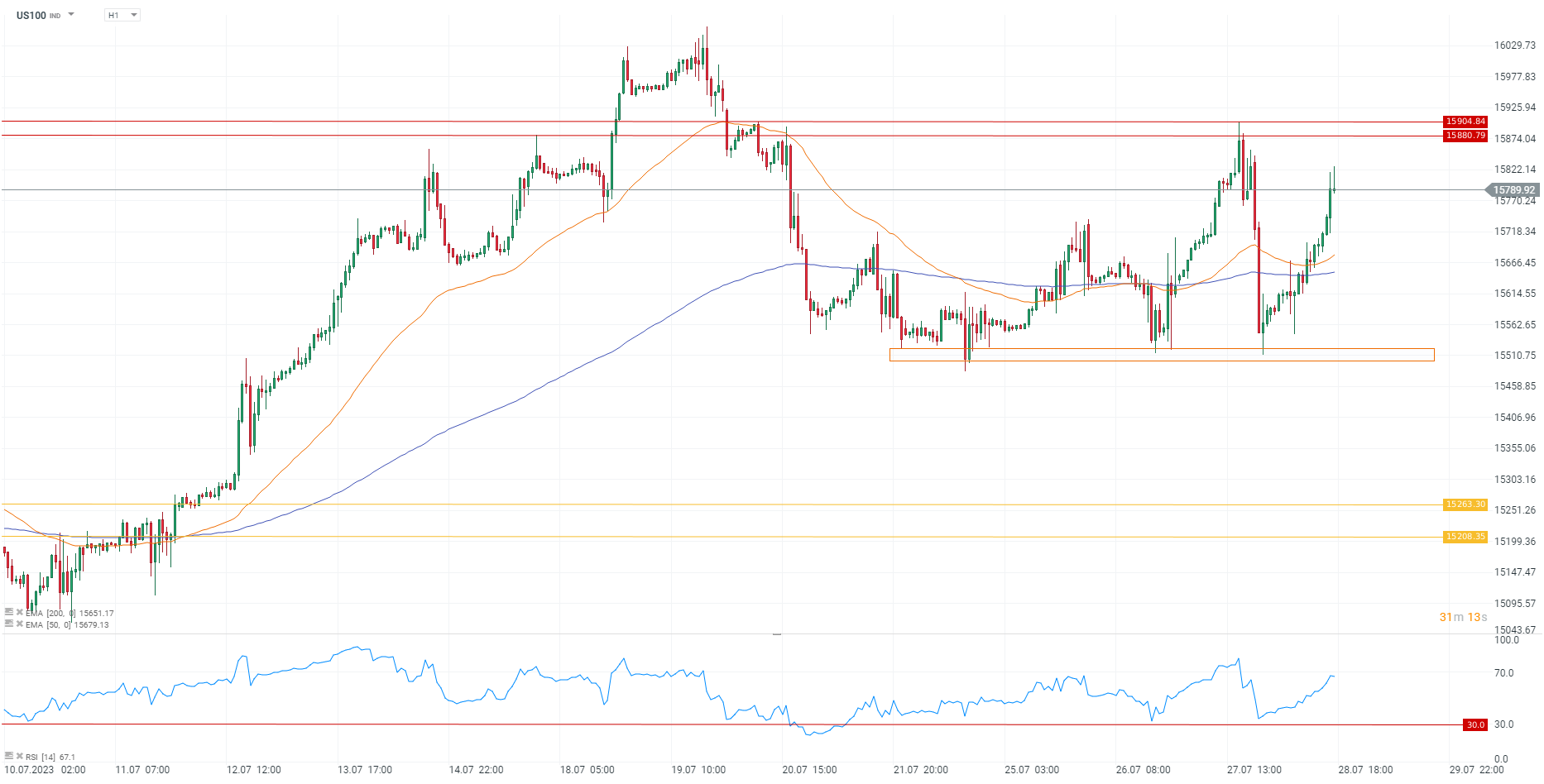Scăderea de aseară a indicelui US100 fost oprită de zona de suport de 15.500 - 15.525 de puncte (dreptunghiul portocaliu), care a reprezentat un nivel important recent. Această schimbare de atitudine de la sfârșitul sesiunii de ieri a ajutat la continuarea impulsului pe parcursul sesiunii de astăzi, timp în care a depășit cele două medii mobile de 50 și 200 de perioade (dreptele portocalii și albastre) reluând mișcarea de creștere. Nivelul de urmărit pentru cumpărători este intervalul 15.880 - 15.905 puncte, în timp ce suport se găsește în zona mediilor mobile și apoi la nivelul cheie de susținere marcat cu portocaliu.