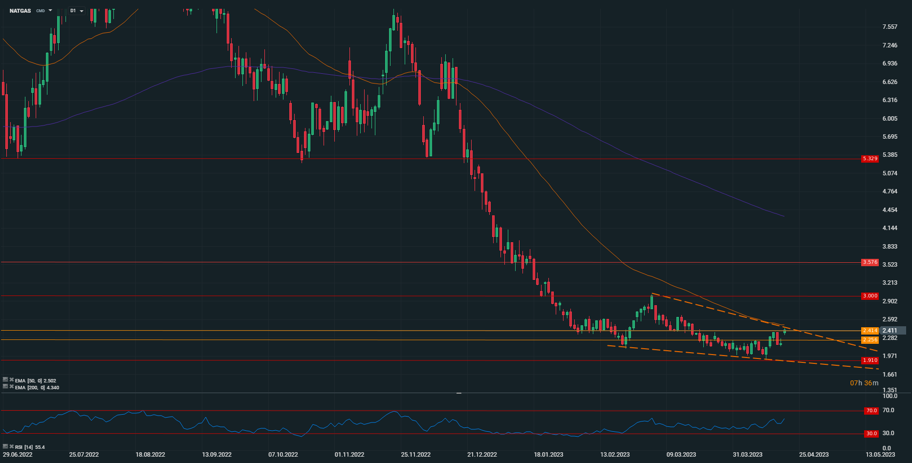 Redresarea vine după ce miercuri a fost înregistrată cea mai puternică scădere zilnică din cinci săptămâni, de aproximativ 8,50%. Cotația evoluează în interiorul unui model descendent de wedge de la sfârșitul lunii februarie. Având în vedere poziția de pe grafic, prețul va fi nevoit să ia o decizie. Fie să spargă limita superioară a formațiunii, care ar putea stabiliza pe termen scurt dinamica, fie să se observe un ricoșeu din zona limitei superioare a formațiunii. Având în vedere prognozele meteo pe termen scurt, primul scenariu ar putea avea o probabilitate mai ridicată, iar cumpărătorii au spațiu de manevră dacă ne uităm pe graficul RSI, care se află în zona neutră de 55 de puncte.
