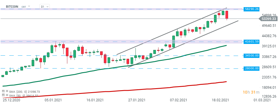 Prețul Bitcoin a scăzut după ce a atins un nou maxim istoric la 58.290 USD. Acest nivel coincide și cu limita superioară a canalului ascendent. Dacă vânzătorii vor reuși să ducă prețul sub limita inferioară a formațiunii, atunci scăderile ar putea continua. Prima țintă potențială pentru vânzători este situată la nivelul de 41.601 dolari. Pe de altă parte, în cazul în care cumpărătorii vor reuși să oprească declinurile acolo, atunci raliul ascendent s-ar putea relua. Sursa: xStation5