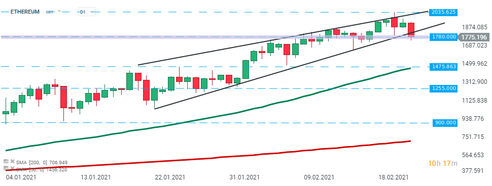 Ethereum testează zona de suport cheie. În cazul unei spargeri în jos, prețul ar putea suferi o scădere de 20% față până la următorul suport, cel de la 1.475,00 USD, care este consolidat suplimentar de media mobilă 50 de perioade (linia verde). Pe de altă parte, în cazul în care cumpărătorii vor reuși să oprească declinul aici, atunci ar putea fi lansat un alt impuls ascendent către maximul istoric. Sursa: xStation5
