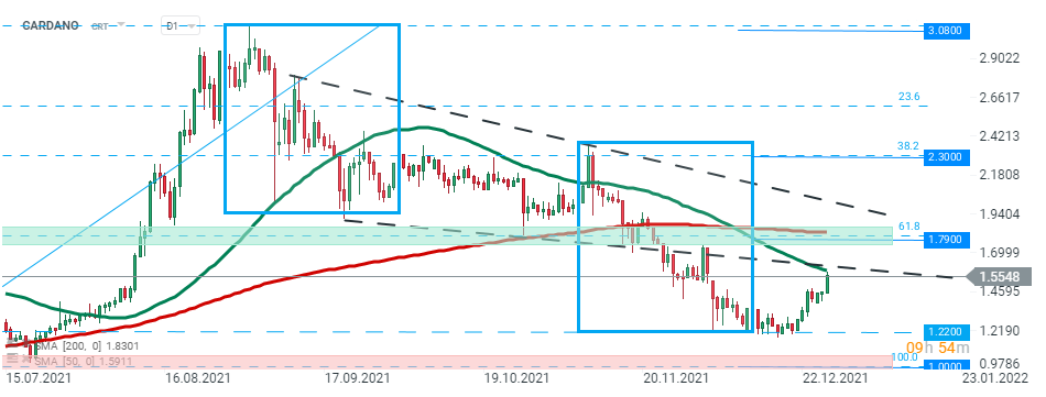 Prețul CARDANO a revenit de la nivelul de 1,22 USD care este marcat cu limita inferioară a structurii 1:1 și testează în prezent limita inferioară depășită anterior a triunghiului care coincide cu media mobilă de 50 de perioade (linia verde). În cazul în care apare o spargere în sus, următoarea țintă pentru cumpărători este situată la 1,79 USD. Sursa: xStation5