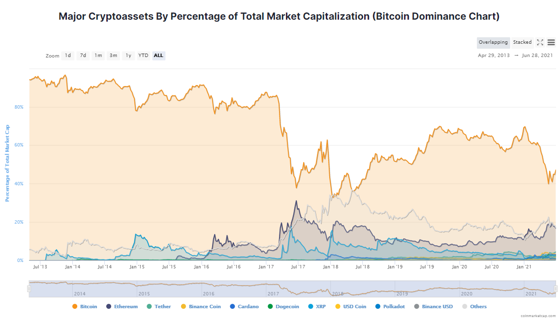 Dominația de piață a Bitcoin crește. Sursa: Coinmarketcap.com