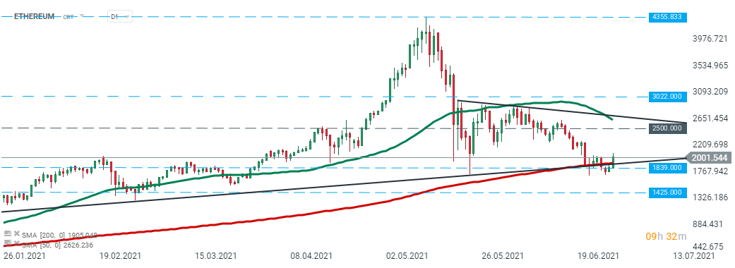 ETHEREUM a început sesiunea de luni mai sus. Prețul a ricoșat din suportul major de la 1.839 USD, care coincide cu linia ascendentă de trend pe termen lung și media mobilă de 200 de perioade (linia verde). Dacă prevalează sentimentul actual, atunci mișcarea de creștere poate accelera către rezistență majoră de la 2.500 USD. Pe de altă parte, dacă se va produce o spargere în jos, mișcarea descendentă se poate accentua spre suportul de la 1.425 USD. Sursa: xStation5