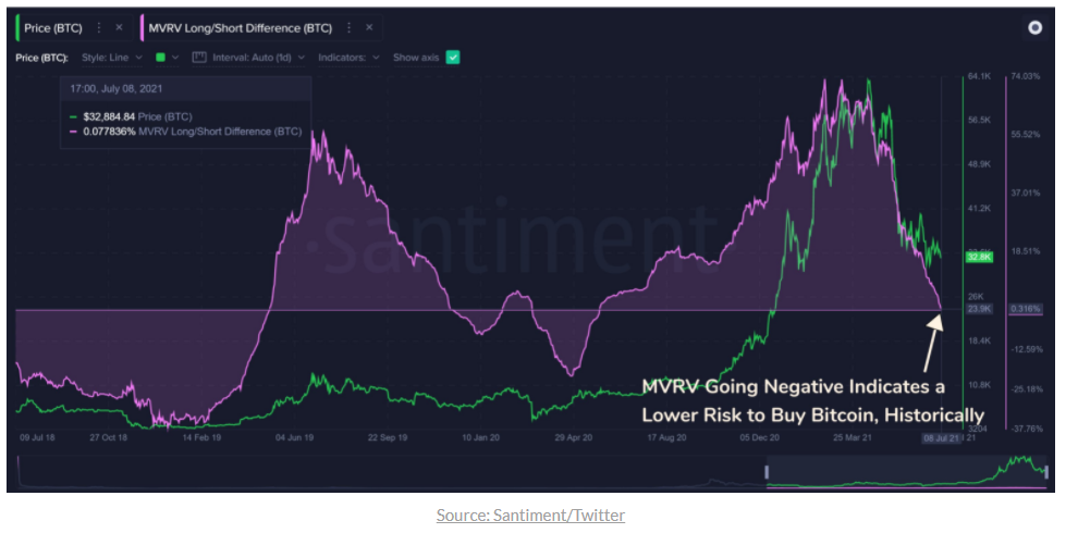 În trecut, când indicatorul MVRV a devenit negativ, acesta a dus adesea la o creștere a prețului Bitcoin. Sursa: Santiment