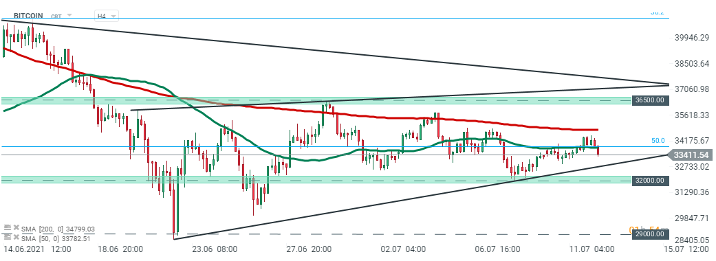 Prețul Bitcoin se mișcă într-o formațiune de tip rising wedge începând cu jumătatea lunii iunie, după o perioadă de consolidare care a început pe 19 mai. Astăzi prețul a spart în jos media mobilă de 50 de perioade și retragerea Fibonacci de 50% a mișcării ascendente începute în martie 2020. În cazul în care se va produce o spargere în jos a formațiunii, atunci investitorii ar trebui să se concentreze asupra nivelului de 32.000 de dolari, unde pot fi găsite reacțiile anterioare ale prețurilor. Cea mai apropiată rezistență majoră se află la nivelul de 36.500 USD. Sursa: xStation5