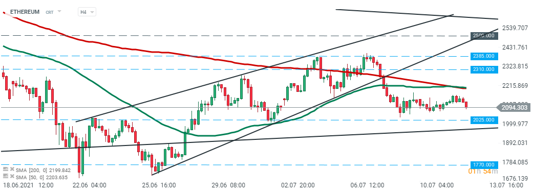 Prețul Bitcoin se mișcă într-o formațiune de tip rising wedge începând cu jumătatea lunii iunie, după o perioadă de consolidare care a început pe 19 mai. Astăzi prețul a spart în jos media mobilă de 50 de perioade și retragerea Fibonacci de 50% a mișcării ascendente începute în martie 2020. În cazul în care se va produce o spargere în jos a formațiunii, atunci investitorii ar trebui să se concentreze asupra nivelului de 32.000 de dolari, unde pot fi găsite reacțiile anterioare ale prețurilor. Cea mai apropiată rezistență majoră se află la nivelul de 36.500 USD. Sursa: xStation5 Prețul Ethereum a spart limita inferioară a formațiunii wedge săptămâna trecută, cu toate acestea vânzătorii nu au reușit să susțină impulsul descendent și mișcarea descendentă s-a oprit în proximitatea suportului de la 2.025,00 USD. Atâta timp cât prețul se află deasupra acestui nivel, este posibil un impuls suplimentar ascendent spre rezistența de la 2.310 USD. Cu toate acestea, în timpul sesiunii de astăzi, se poate vedea activitatea crescută a vânzătorilor. În cazul în care se va produce o spargere a suportului menționat anterior, cel de la nivelul de 2.025 USD, atunci mișcarea descendentă poate accelera până la nivelul de 1.770 USD. Sursa: xStation5