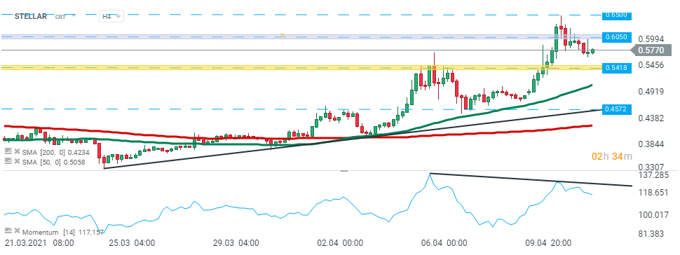 Deținerile de XLM ale Grayscale. Sursa: BYBT.com Stellar - ieri cumpărătorii au reușit să depășească rezistența majoră de la 0,6050 dolari, însă vânzătorii și-au recăpătat controlul, iar prețul a scăzut. Astăzi, taurii au făcut o nouă încercare nereușită de a avansa. Dacă prevalează sentimentul actual, atunci cel mai apropiat suport este la 0,5418 USD. Sursa: xStation5