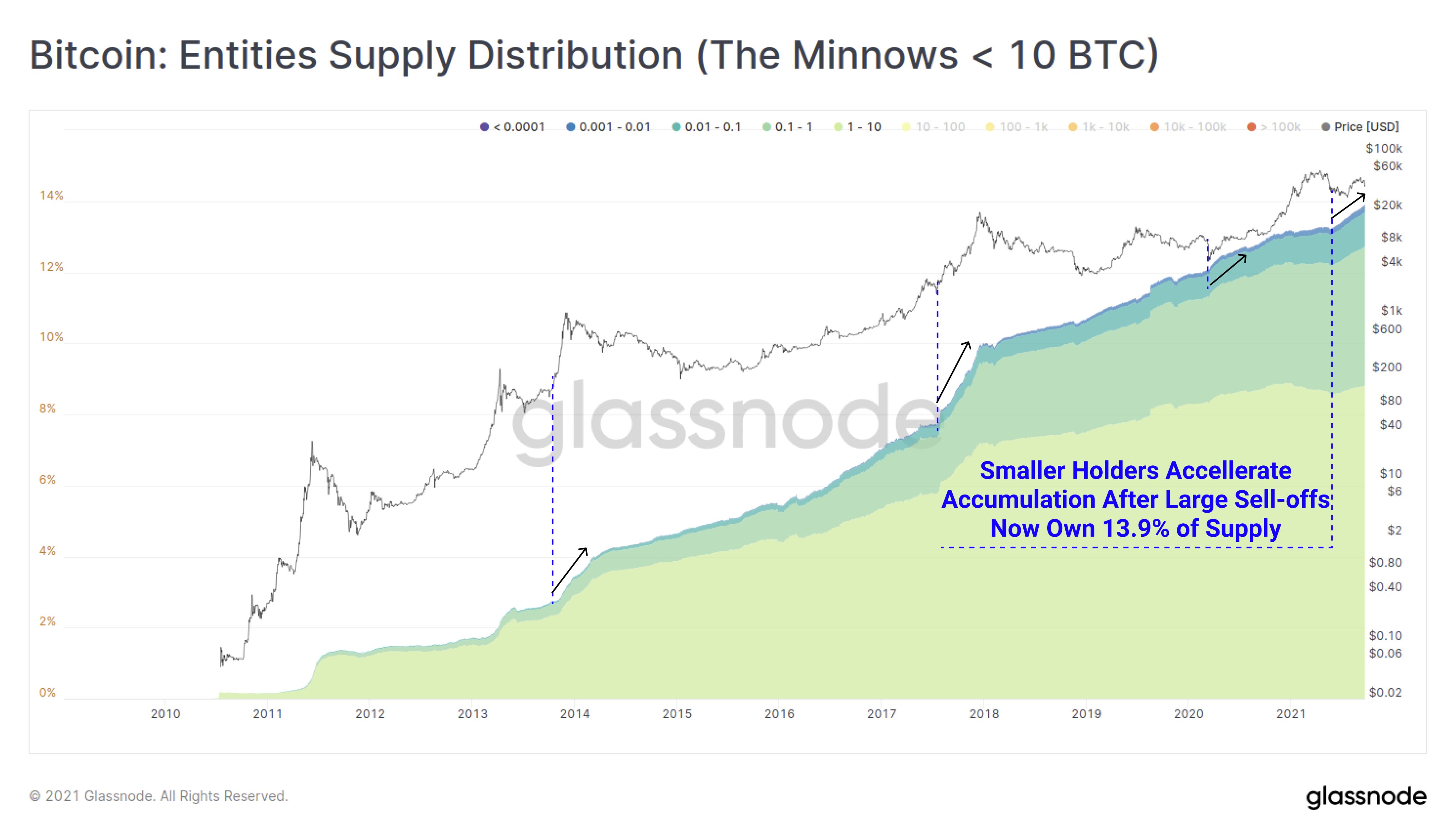 Deținătorii de Bitcoin mici sau cei care dețin mai puțin de 10 BTC și-au accelerat acumularea de BTC după vânzări mari, conform datelor blockchain compilate de Glassnode.