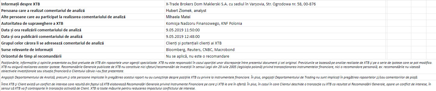 "Acest material este o comunicare de marketing în sensul articolului 24 alineatul (3) din Directiva 2014/65 / UE a Parlamentului European și a Consiliului din 15 mai 2014 privind piețele de instrumente financiare, și de modificare a Directivei 2002/92 / CE și a Directivei 2011 / 61 / UE (MiFID II). Comunicarea de marketing nu este o recomandare de investiții sau o recomandare de informații sau o recomandare care sugerează o strategie de investiții în sensul Regulamentului (UE) nr. 596/2014 al Parlamentului European și al Consiliului din 16 aprilie 2014 privind abuzul de piață ( reglementarea abuzului de piață) și de abrogare a Directivei 2003/6 / CE a Parlamentului European și a Consiliului și a Directivelor Comisiei 2003/124 / CE, 2003/125 / CE și 2004/72 / CE și a Regulamentului delegat (UE) 2016/958 al Comisiei din 9 596/2014 al Parlamentului European și al Consiliului în ceea ce privește standardele tehnice de reglementare pentru aranjamentele tehnice pentru prezentarea obiectivă a recomandărilor de investiții sau a altor informații care sugerează strategii de investiții și pentru dezvăluirea de interese particulare sau indicații de conflicte de interese sau orice alte sfaturi, inclusiv în domeniul consultanței în materie de investiții, în sensul Legii privind tranzacționarea cu instrumente financiare din 29 iulie 2005 (de ex. Journal of Laws 2019, articolul 875, astfel cum a fost modificat). Comunicarea de marketing este pregătită cu cea mai mare diligență, obiectivitate, prezintă faptele cunoscute autorului la data pregătirii și este lipsită de orice elemente de evaluare. Comunicarea de marketing este pregătită fără a lua în considerare nevoile clientului, situația sa financiară individuală și nu prezintă nicio strategie de investiții în niciun fel. Comunicarea de marketing nu constituie o ofertă de vânzare, oferire, abonament, invitație la cumpărare, reclamă sau promovare a oricărui instrument financiar. XTB SA nu este responsabilă pentru acțiunile sau omisiunile niciunui client, în special pentru achiziționarea sau cedarea instrumente, întreprinse pe baza informațiilor conținute în această comunicare de marketing. XTB SA nu va accepta răspunderea pentru nicio pierdere sau daună, inclusiv, fără limitare, orice pierdere care poate apărea direct sau indirect, efectuată pe baza informațiilor conținute în această comunicare de marketing. În cazul în care comunicarea de marketing conține informații despre orice rezultat cu privire la instrumentele financiare indicate în acestea, acestea nu constituie nicio garanție sau prognoză cu privire la rezultatele viitoare. Performanțele anterioare nu indică neapărat rezultatele viitoare și orice persoană care acționează pe baza acestor informații o face pe propriul risc. Acest material nu este emis pentru a influenta deciziile de tranzacționare ale niciunei persoane. Informațiile cuprinse în cadrul acestui material nu sunt prezentate pentru a fi aplicate, copiate sau testate în cadrul tranzacțiilor dumneavoastră. Informațiile cuprinse în cadrul acestui material sunt emise în baza experienței proprii a emitentului și nu reprezintă o recomandare individuală, nu vizează atingerea anumitor obiective, randamente financiare și nu se adresează nevoilor niciunei persoane anume care ar primi-o. Premisele acestui material nu au în vedere situația și persoana dumneavoastră deci nu recomandăm utilizarea acestor informații sub orice formă. Utilizarea informațiilor cuprinse în cadrul acestui material în orice modalitate se face pe propria dumneavoastră răspundere. Acest material este emis de către un analist pentru care își asumă răspunderea XTB SA, persoană juridică autorizată de KNF – Autoritatea de Supraveghere Financiara din Polonia."