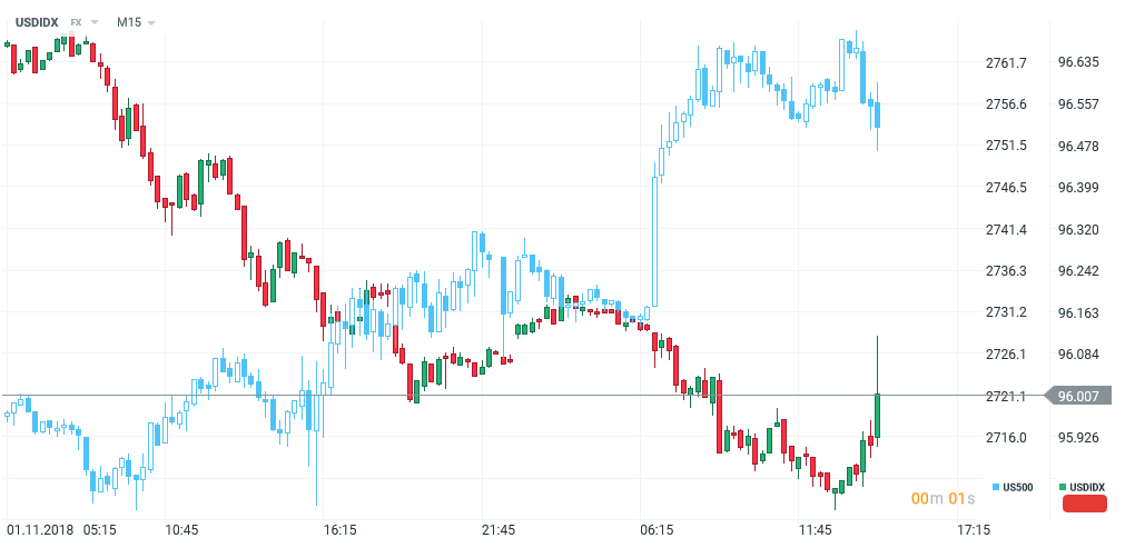 Grafic USDIDX, US500 (albastru) - M15. Sursa: xStation5