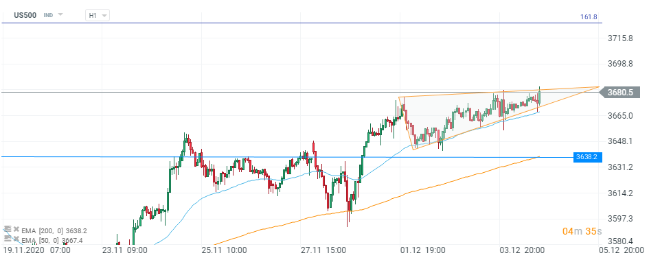Piața pariază că vom obține un pachet de ajutor în curând. În orice caz, este posibil ca semnele de deteriorare economică să pună presiune asupra celor două tabere pentru a oferi un nou pachet de ajutoare în viitorul apropiat. În acest context, US500 a continuat să avanseze, reușind chiar să marcheze un nou maxim istoric. Ultimele ore de tranzacționare ale săptămânii ar putea fi definitorii pentru evoluția indicelui pe termen scurt. Se observă că prețul evoluează în interiorul unei formațiuni ascendente de triunghi, dar intervalul de evoluție tinde să fie tot mai îngust pe măsură ce cotația se îndreaptă către vârful formațiunii. O spargere ascendentă ar putea deschide drumul către o închidere zilnică și, ulterior, săptămânală la noi maxime istorice. Un astfel de scenariu ar putea oferi un impuls de încredere cumpărătorilor la începutul săptămânii viitoare, asta în cazul în care în timpul weekendului nu vor fi publicate informații care să aibă un impact negativ asupra sentimentului.