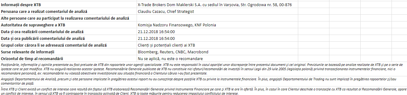 "Acest material este o comunicare de marketing în sensul articolului 24 alineatul (3) din Directiva 2014/65 / UE a Parlamentului European și a Consiliului din 15 mai 2014 privind piețele de instrumente financiare, și de modificare a Directivei 2002/92 / CE și a Directivei 2011 / 61 / UE (MiFID II). Comunicarea de marketing nu este o recomandare de investiții sau o recomandare de informații sau o recomandare care sugerează o strategie de investiții în sensul Regulamentului (UE) nr. 596/2014 al Parlamentului European și al Consiliului din 16 aprilie 2014 privind abuzul de piață ( reglementarea abuzului de piață) și de abrogare a Directivei 2003/6 / CE a Parlamentului European și a Consiliului și a Directivelor Comisiei 2003/124 / CE, 2003/125 / CE și 2004/72 / CE și a Regulamentului delegat (UE) 2016/958 al Comisiei din 9 596/2014 al Parlamentului European și al Consiliului în ceea ce privește standardele tehnice de reglementare pentru aranjamentele tehnice pentru prezentarea obiectivă a recomandărilor de investiții sau a altor informații care sugerează strategii de investiții și pentru dezvăluirea de interese particulare sau indicații de conflicte de interese sau orice alte sfaturi, inclusiv în domeniul consultanței în materie de investiții, în sensul Legii privind tranzacționarea cu instrumente financiare din 29 iulie 2005 (de ex. Journal of Laws 2019, articolul 875, astfel cum a fost modificat). Comunicarea de marketing este pregătită cu cea mai mare diligență, obiectivitate, prezintă faptele cunoscute autorului la data pregătirii și este lipsită de orice elemente de evaluare. Comunicarea de marketing este pregătită fără a lua în considerare nevoile clientului, situația sa financiară individuală și nu prezintă nicio strategie de investiții în niciun fel. Comunicarea de marketing nu constituie o ofertă de vânzare, oferire, abonament, invitație la cumpărare, reclamă sau promovare a oricărui instrument financiar. XTB SA nu este responsabilă pentru acțiunile sau omisiunile niciunui client, în special pentru achiziționarea sau cedarea instrumente, întreprinse pe baza informațiilor conținute în această comunicare de marketing. XTB SA nu va accepta răspunderea pentru nicio pierdere sau daună, inclusiv, fără limitare, orice pierdere care poate apărea direct sau indirect, efectuată pe baza informațiilor conținute în această comunicare de marketing. În cazul în care comunicarea de marketing conține informații despre orice rezultat cu privire la instrumentele financiare indicate în acestea, acestea nu constituie nicio garanție sau prognoză cu privire la rezultatele viitoare. Performanțele anterioare nu indică neapărat rezultatele viitoare și orice persoană care acționează pe baza acestor informații o face pe propriul risc. Acest material nu este emis pentru a influenta deciziile de tranzacționare ale niciunei persoane. Informațiile cuprinse în cadrul acestui material nu sunt prezentate pentru a fi aplicate, copiate sau testate în cadrul tranzacțiilor dumneavoastră. Informațiile cuprinse în cadrul acestui material sunt emise în baza experienței proprii a emitentului și nu reprezintă o recomandare individuală, nu vizează atingerea anumitor obiective, randamente financiare și nu se adresează nevoilor niciunei persoane anume care ar primi-o. Premisele acestui material nu au în vedere situația și persoana dumneavoastră deci nu recomandăm utilizarea acestor informații sub orice formă. Utilizarea informațiilor cuprinse în cadrul acestui material în orice modalitate se face pe propria dumneavoastră răspundere. Acest material este emis de către un analist pentru care își asumă răspunderea XTB SA, persoană juridică autorizată de KNF – Autoritatea de Supraveghere Financiara din Polonia."