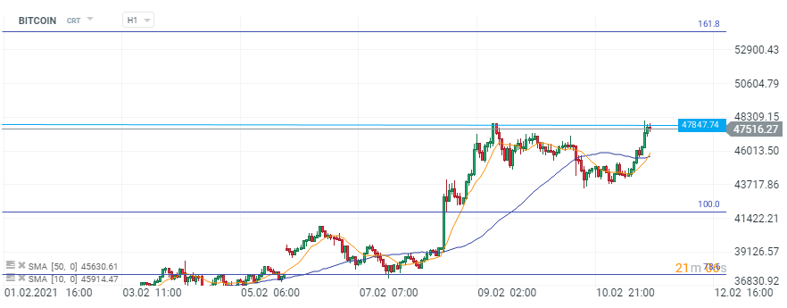 Analizând graficul observăm că prețul Bitcoin a revenit în zona maximelor atinse la început de săptămână de la 48.000 USD. Acesta este un nivel psihologic ceea ce presupune mai multă opoziție în calea mișcării de creștere a cumpărătorilor. Având în vedere raliul ascendent puternic, o respingere poate fi posibilă ca urmare a unei tendințe de marcare a profitului, zona de 42.000 USD fiind un nivel de suport. Totuși, trebuie subliniat că această piață este extrem de volatilă și în ultima perioadă este sensibilă în ceea ce privește fluxurile de știri, motiv pentru care direcția de evoluție este dificil de intuit.