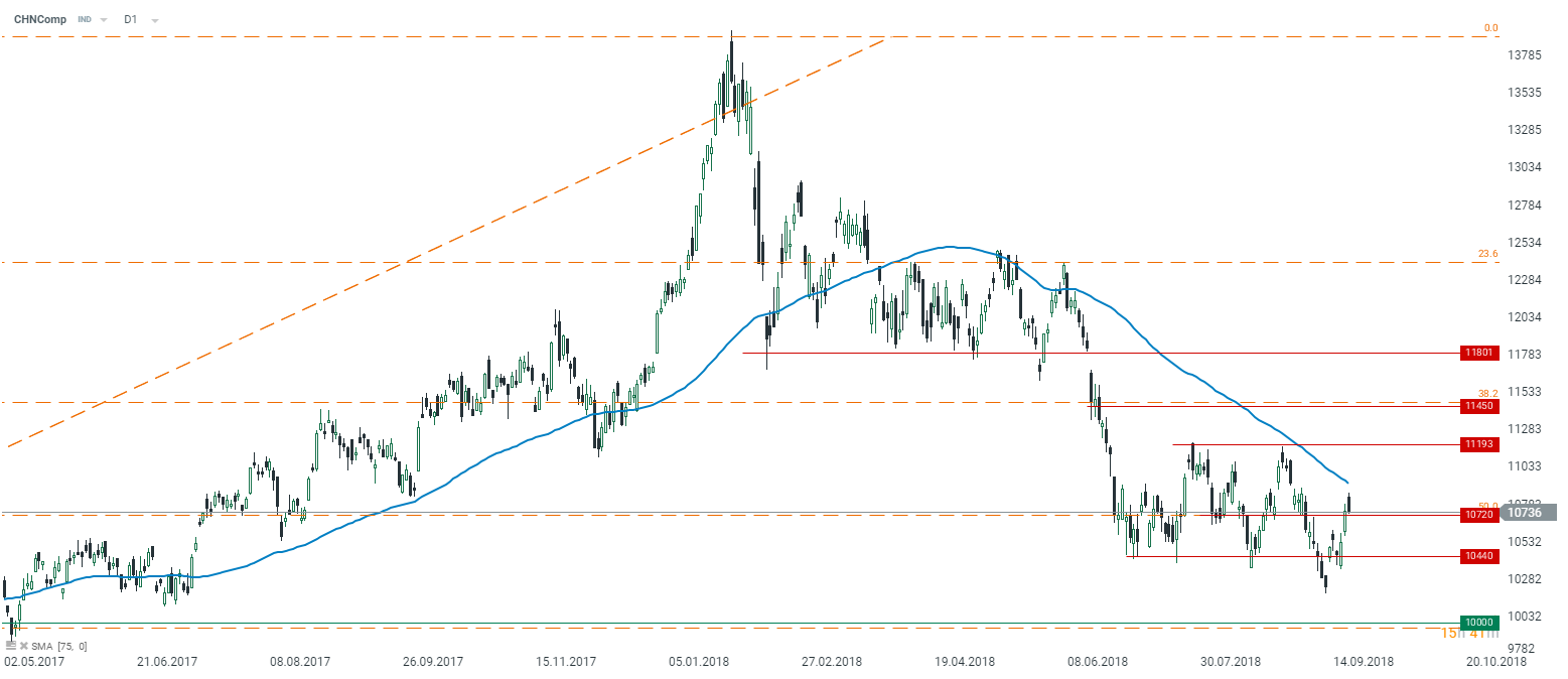 Hang Seng încearcă să mențină cel puțin o parte din câștigurile înregistrate astăzi. În cel mai scurt timp, linia 75DMA ar putea fi văzută ca un obstacol major pentru cumpărători. Sursa: xStation5