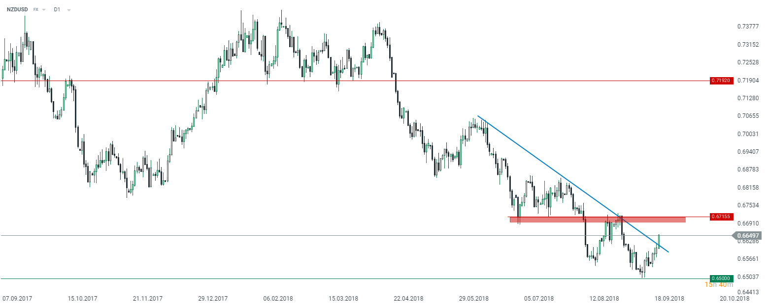 NZDUSD crește în această dimineață (mai mult de 0,5%), depășind linia de trend pe termen mediu. Cumpărătorii ar putea continua aprecierea spre zona de rezistență localizată la aproximativ 0.6715. Chiar dacă mișcarea pare promițătoare din punct de vedere tehnic, iar NZD rămâne remarcabil de supravândută, traderii trebuie totuși să rămână prudenți, având în vedere ultima deteriorare a datelor macroeconomice. Sursa: xStation5
