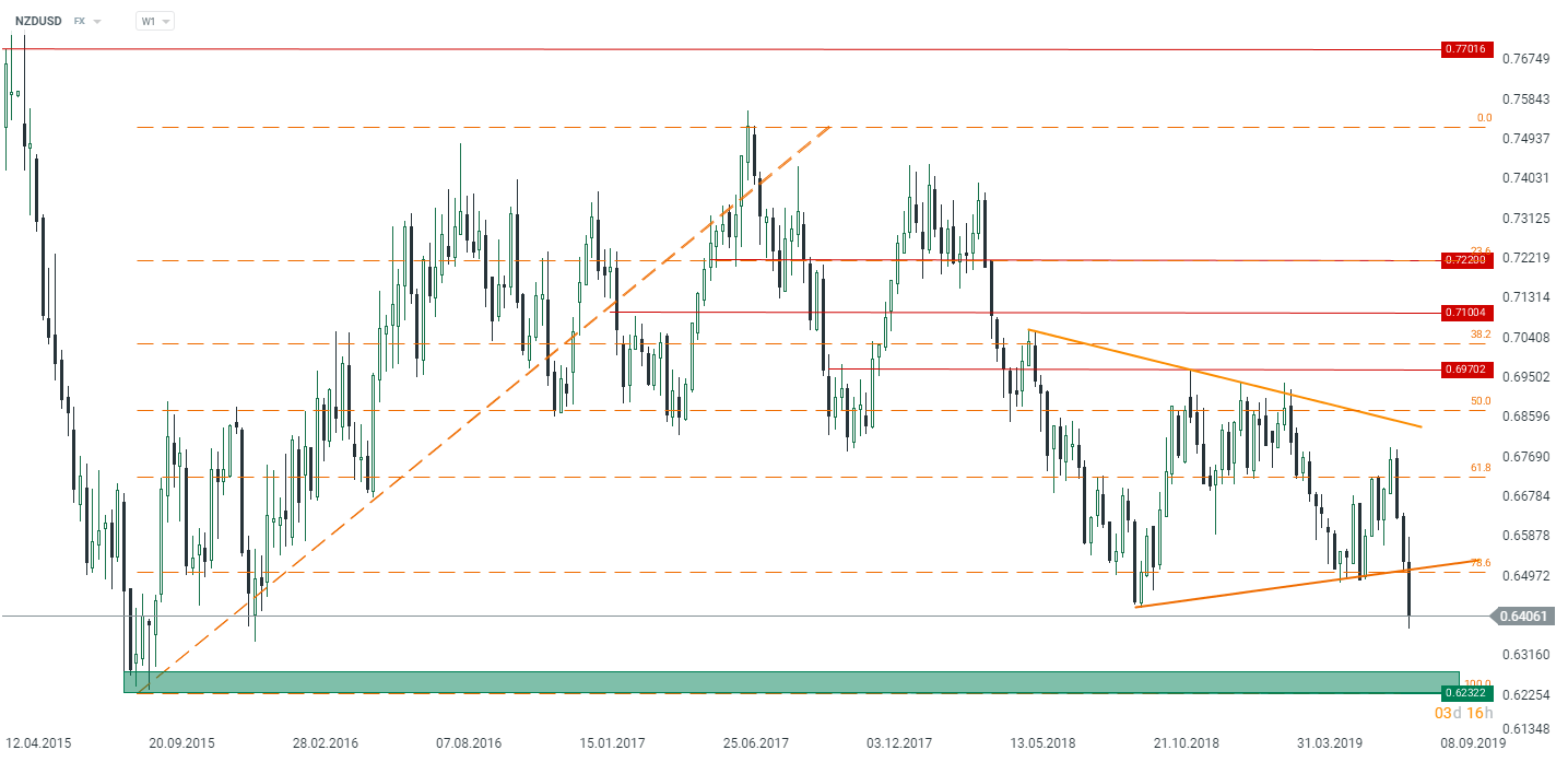 Cotația NZDUSD s-a depreciat puternic în urma deciziei șocante de reducere a ratei cu 50 bps, implementată de RBNZ. Sursa: xStation5
