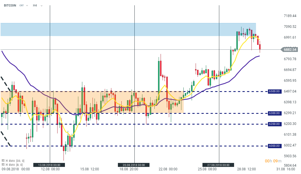 BITCOIN a corectat o parte din câștigurile înregistrate anterior. Moneda spărsese media mobilă de 8 perioade ilustrată pe graficul H4 (linia galbenă) și oscila ușor sub nivelul de 6900 de dolari la momentul scrierii articolului. Sursa: xStation5
