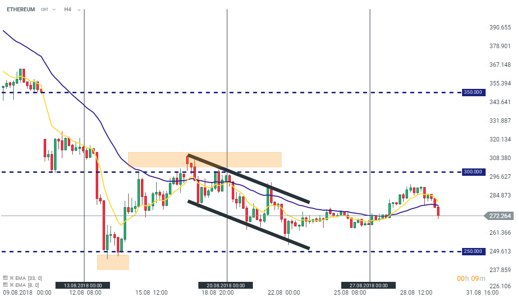 ETHEREUM, la fel ca Bitcoin, a scăzut (cu aproape 4%) și a spart mediile mobile de 8 și 33 de perioade ilustrate pe graficul H4 (linia galbenă și cea mov). Moneda cu cea de-a doua cea mai mare capitalizare de piață se tranzacționa imediat sub nivelul de 275 de dolari la momentul scrierii articolului. Sursa: xStation5