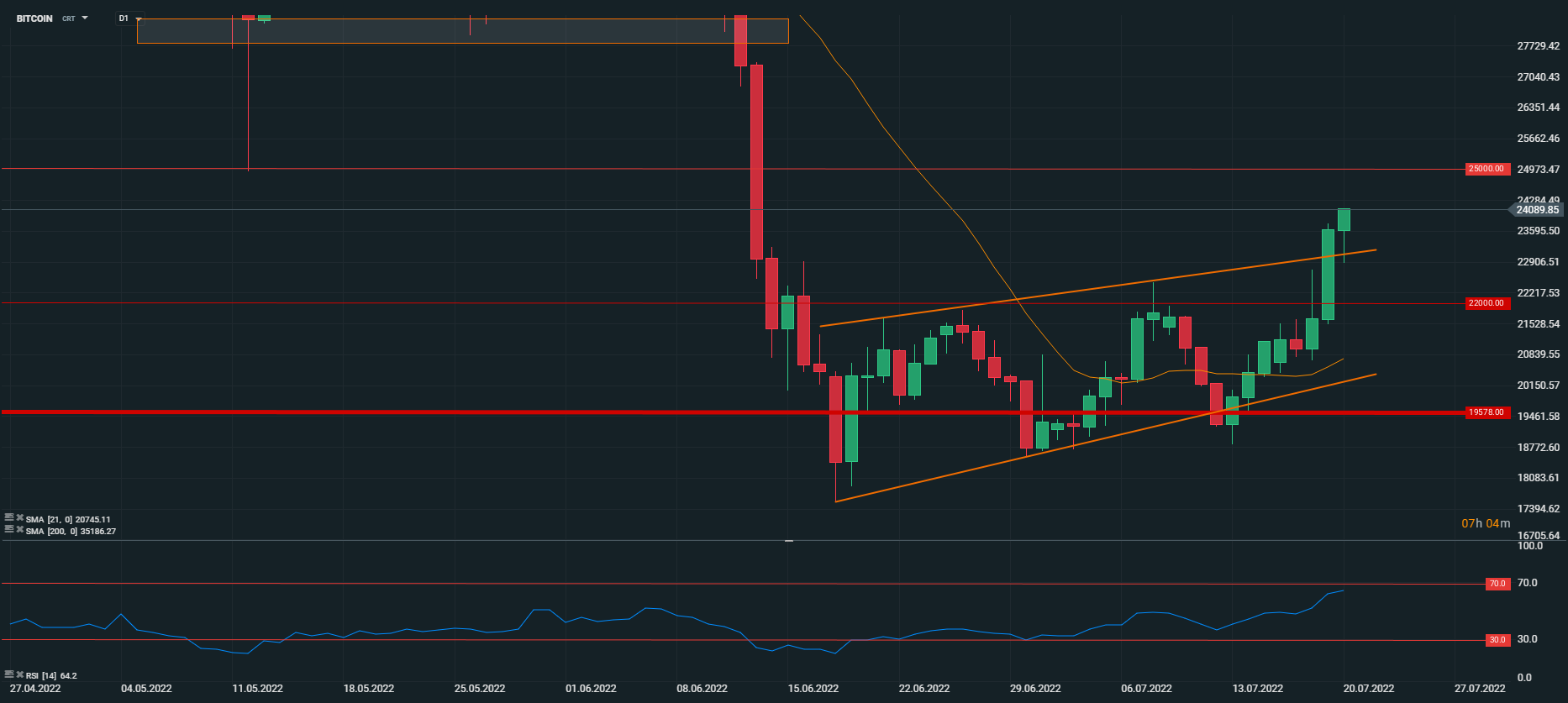 A fost o seară impresionantă pentru Bitcoin ieri, care a reușit să spargă limita superioară a formațiunii de wedge și a dus prețul la peste 23.000 de dolari. Mișcarea ascendentă continuă și astăzi și cumpărătorii par să fi preluat controlul, respingând presiunea vânzătorilor (umbra inferioară amplă). Depășirea zonei de 24.000 de dolari deschide drumul către următorul prag rotund, 25.000 de dolari. Pe de altă parte, un ricoșeu ar putea să retrimită Bitcoin către zona de 22.000 USD.