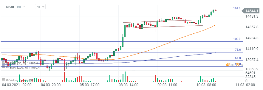Analizând graficul H1 al DE30, putem observa că indicele a reușit să marcheze noi maxime istorice, profitând de perioada favorabilă. După perioada de consolidare începută luni, cumpărătorii au reușit să găsească suficientă motivație pentru a depăși limita inferioară a canalului lateral. Mișcarea a beneficiat de o cantitate semnificativă de inerție care a propulsat cotația către un nivel interesant de rezistență la 14.550 de puncte, care este susținut și de o retragere exterioară Fibonacci de 161,8% din impulsul ascendent de la sfârșitul lunii februarie. Spargerea a fost posibilă și datorită unui volum semnificativ de cumpărători în piață, conform graficului de volum din partea inferioară, care au dus la apariția unui impuls puternic. Având în vedere importanța zonei actuale și faptul că, la nivelul investitorilor, continuă să se observe un oarecare grad de prudență, cotația ar putea suferi un ricoșeu determinat și de o potențială tendință de marcare a profitului. În acest scenariu, media mobilă de 50 de perioade (linia galbenă) pare a fi primul punct de susținere.