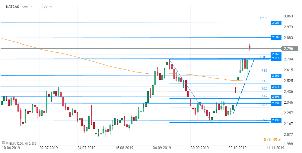 Din punct de vedere tehnic, prețul se află pe un trend ascendent destul de abrupt care a fost alimentat de prognoze meteo pesimiste. În timpul acestui impuls de creștere, cotația a depășit mai multe zone de interes, printre care nivelurile 2,38 și 2,50 care sunt susținute de retrageri Fibonacci de 38,2%, respectiv 61,8% din corecția descendentă începută pe 17 septembrie. Vedem că un obstacol mai dificil de depășit a fost la 2,705 unde se află o retragere de 100% din mișcarea menționată anterior. Cumpărătorii au reușit să depășească acest prag astăzi, piața deschizând sesiunea cu un gap pozitiv de aproape 4%, profitând de contextul favorabil pentru preț. În plus, săptămâna trecută, pe graficul daily, a fost depășită și media mobilă exponențială pe 200 de perioade, fapt ce indică un scenariu constructiv pentru preț pe termen scurt, dar chiar și mediu dacă ținem cont că sezonul rece este de abia la început, iar cererea de gaze naturale va continua să crească. Astfel, următoarele niveluri de rezistență ce merită urmărite ar fi la 2,889 și 3,009.