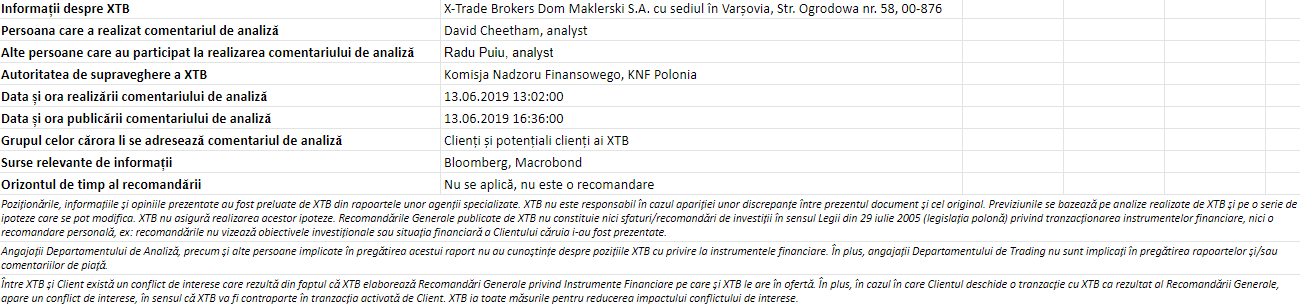 "Acest material este o comunicare de marketing în sensul articolului 24 alineatul (3) din Directiva 2014/65 / UE a Parlamentului European și a Consiliului din 15 mai 2014 privind piețele de instrumente financiare, și de modificare a Directivei 2002/92 / CE și a Directivei 2011 / 61 / UE (MiFID II). Comunicarea de marketing nu este o recomandare de investiții sau o recomandare de informații sau o recomandare care sugerează o strategie de investiții în sensul Regulamentului (UE) nr. 596/2014 al Parlamentului European și al Consiliului din 16 aprilie 2014 privind abuzul de piață ( reglementarea abuzului de piață) și de abrogare a Directivei 2003/6 / CE a Parlamentului European și a Consiliului și a Directivelor Comisiei 2003/124 / CE, 2003/125 / CE și 2004/72 / CE și a Regulamentului delegat (UE) 2016/958 al Comisiei din 9 596/2014 al Parlamentului European și al Consiliului în ceea ce privește standardele tehnice de reglementare pentru aranjamentele tehnice pentru prezentarea obiectivă a recomandărilor de investiții sau a altor informații care sugerează strategii de investiții și pentru dezvăluirea de interese particulare sau indicații de conflicte de interese sau orice alte sfaturi, inclusiv în domeniul consultanței în materie de investiții, în sensul Legii privind tranzacționarea cu instrumente financiare din 29 iulie 2005 (de ex. Journal of Laws 2019, articolul 875, astfel cum a fost modificat). Comunicarea de marketing este pregătită cu cea mai mare diligență, obiectivitate, prezintă faptele cunoscute autorului la data pregătirii și este lipsită de orice elemente de evaluare. Comunicarea de marketing este pregătită fără a lua în considerare nevoile clientului, situația sa financiară individuală și nu prezintă nicio strategie de investiții în niciun fel. Comunicarea de marketing nu constituie o ofertă de vânzare, oferire, abonament, invitație la cumpărare, reclamă sau promovare a oricărui instrument financiar. XTB SA nu este responsabilă pentru acțiunile sau omisiunile niciunui client, în special pentru achiziționarea sau cedarea instrumente, întreprinse pe baza informațiilor conținute în această comunicare de marketing. XTB SA nu va accepta răspunderea pentru nicio pierdere sau daună, inclusiv, fără limitare, orice pierdere care poate apărea direct sau indirect, efectuată pe baza informațiilor conținute în această comunicare de marketing. În cazul în care comunicarea de marketing conține informații despre orice rezultat cu privire la instrumentele financiare indicate în acestea, acestea nu constituie nicio garanție sau prognoză cu privire la rezultatele viitoare. Performanțele anterioare nu indică neapărat rezultatele viitoare și orice persoană care acționează pe baza acestor informații o face pe propriul risc. Acest material nu este emis pentru a influenta deciziile de tranzacționare ale niciunei persoane. Informațiile cuprinse în cadrul acestui material nu sunt prezentate pentru a fi aplicate, copiate sau testate în cadrul tranzacțiilor dumneavoastră. Informațiile cuprinse în cadrul acestui material sunt emise în baza experienței proprii a emitentului și nu reprezintă o recomandare individuală, nu vizează atingerea anumitor obiective, randamente financiare și nu se adresează nevoilor niciunei persoane anume care ar primi-o. Premisele acestui material nu au în vedere situația și persoana dumneavoastră deci nu recomandăm utilizarea acestor informații sub orice formă. Utilizarea informațiilor cuprinse în cadrul acestui material în orice modalitate se face pe propria dumneavoastră răspundere. Acest material este emis de către un analist pentru care își asumă răspunderea XTB SA, persoană juridică autorizată de KNF – Autoritatea de Supraveghere Financiara din Polonia."
