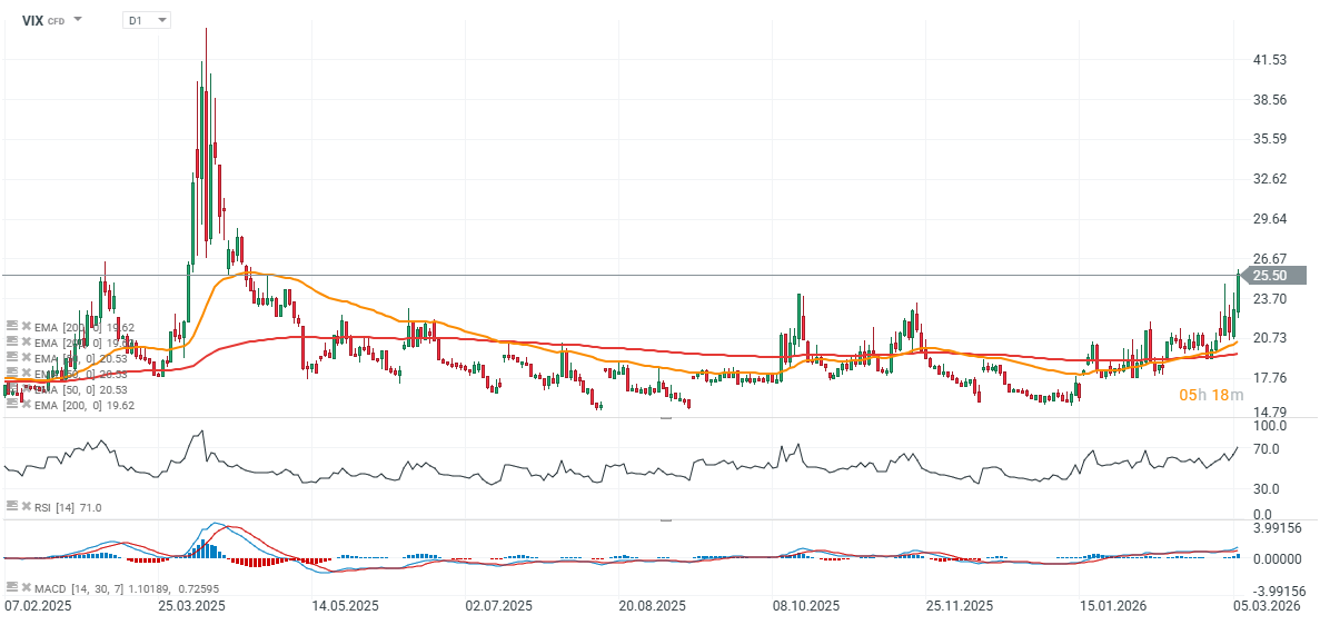 Contractele futures VIX urcă la niveluri nemaiîntâlnite din aprilie 2025, când piețele au fost zguduite de temerile legate de tarifele impuse de Donald Trump și de impactul potențial al acestora asupra economiei globale. Cererea de acoperire prin expunere VIX crește, de asemenea, înainte de weekend, deoarece investitorii sunt reticenți să lase pozițiile neacoperite în cazul în care conflictul se agravează în weekend.