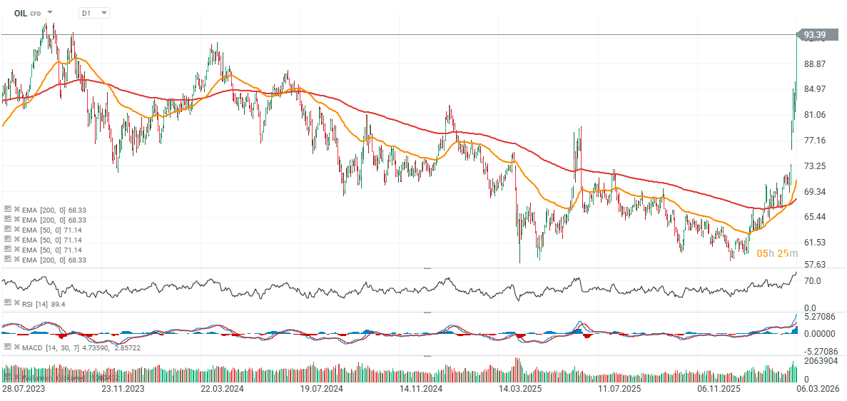 Contractele futures pe țițeiul Brent (OIL) cresc astăzi cu peste 11%, prelungind impulsul ascendent anterior și depășind deja prețul de 93 USD pe baril. Odată cu petrolul, cresc și îngrijorările legate de inflație, randamentele titlurilor de stat americane și dolarul american. Cererea pentru VIX a crescut pe fondul așteptărilor privind o volatilitate mai mare a indicelui S&P 500, care, în ciuda tensiunilor geopolitice și a riscurilor crescânde de stagflatie, rămâne cu doar aproximativ 5% sub maximul istoric de aproape 7.000 de puncte.
