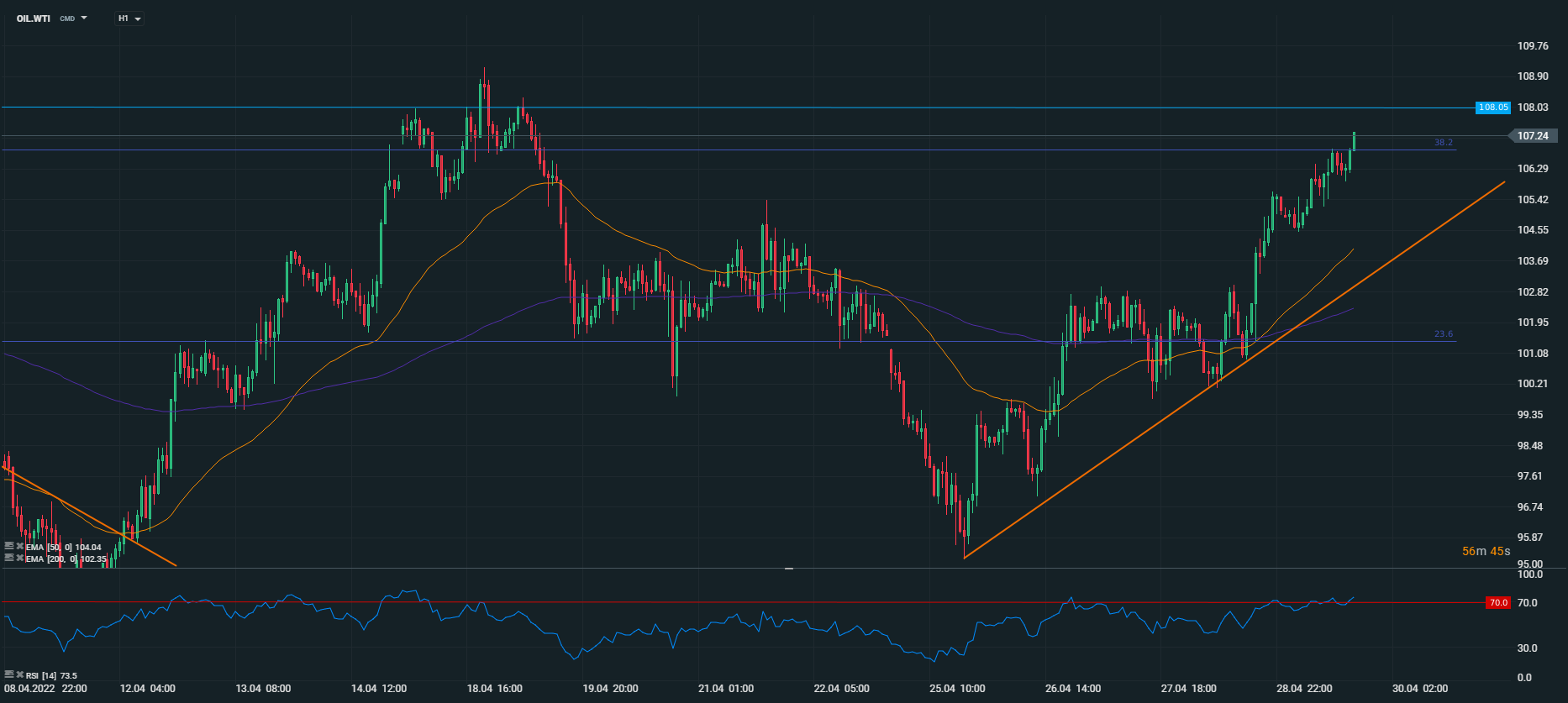 Din punct de vedere tehnic, cotația WTI se află în cadrul unei secvențe ascendente de pe 25 aprilie, când a atins un minim local la aproximativ 95,31 USD per baril. Din acel punct, traseul materiei prime nu a fost lin dar în ultima perioadă cumpărătorii au beneficiat de o accelerare a dinamicii. În prezent, prețul încearcă să depășească zona de rezistență de la aproximativ 107 USD per baril, care este susținută de o retragere Fibonacci de 38,2% din corecția suferită în perioada 8-16 martie. O închidere săptămânală deasupra acestui prag i-ar pune într-o poziție bullish pe cumpărători, care ar putea începe săptămâna viitoare cu o încercare de a extinde mișcarea către nivelul de 108 USD per baril, care este marcat de o serie de maxime locale. Acest scenariu este valid în contextul în care nu vor avea loc modificări majore ale aspectelor fundamentale în timpul weekendului.